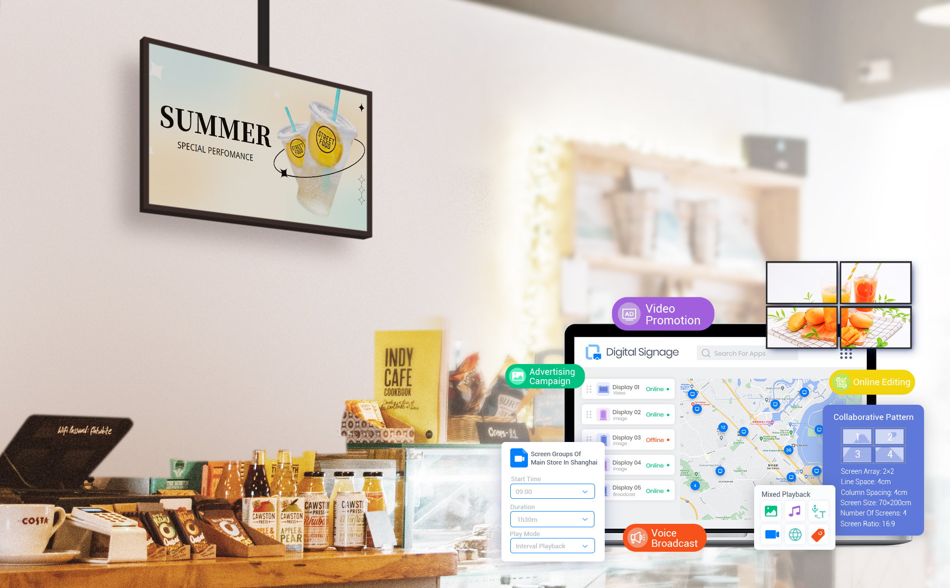 With just one click, you can publish the same content to each screen on a multi-screen wall, or expand it as a whole across all screens to enhance the creativity and inspiration of marketing.