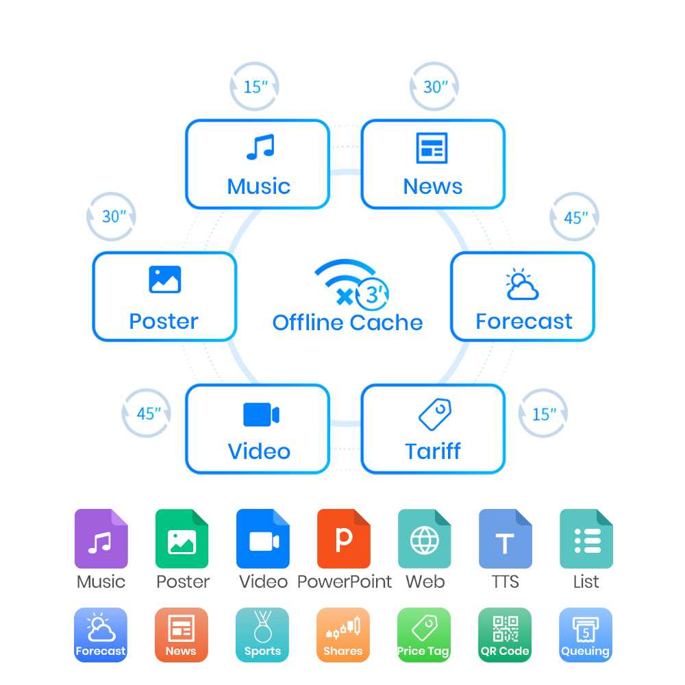 Support a variety of file playback formats: text, pictures, video, audio, etc., also can support mixing, carousel, insert, list and split screen playback.