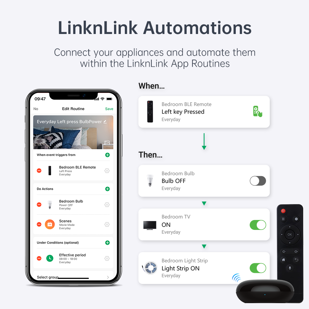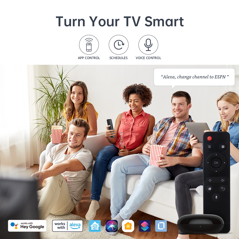 Turn your traditional TV to be smart in different ways: Using smart phone with App, voice control, set schedules or to be triggered in automations.