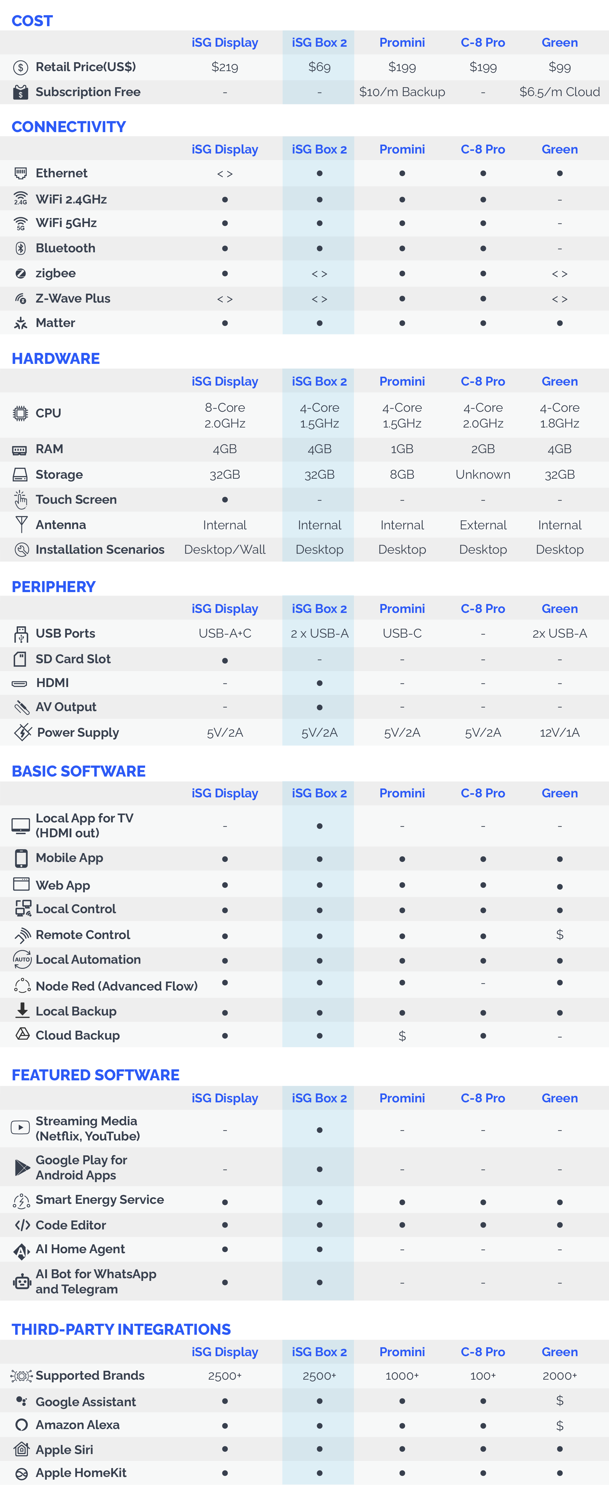 Based on our original iSG Display and enhanced iSG Display Max, we’ve elevated every aspect based on your feedback and will introduce the exciting new features: Unbeatable Price: Now starting at just $49.90 - 1/4 the cost of iSG Display Max and 1/2 of basic Home Assistant hubs. Enjoy powerful smart home control at an incredible value. Multi-Option Controls: Manage and control your devices seamlessly via web, smartphone app, tablet app, voice (with smart speakers), and TV (using remote). AI Agent Service: Proactively delivers intelligent services: security monitoring, health & wellness support, dynamic scene adaptation, and energy management. Natural-language control from anywhere via Telegram and WhatsApp - chat or voice commands.