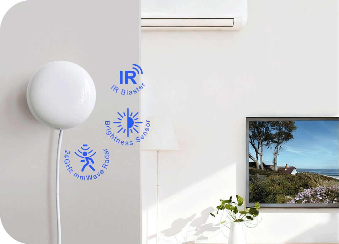 Senses where others can't. Powered by 3rd-Gen 24GHz mmWave technology, it delivers reliable presence detection even through obstacles. Install it inside a cupboard or hide it behind decor for Invisible Sensing. Includes IR blaster to turn dumb appliances smart.